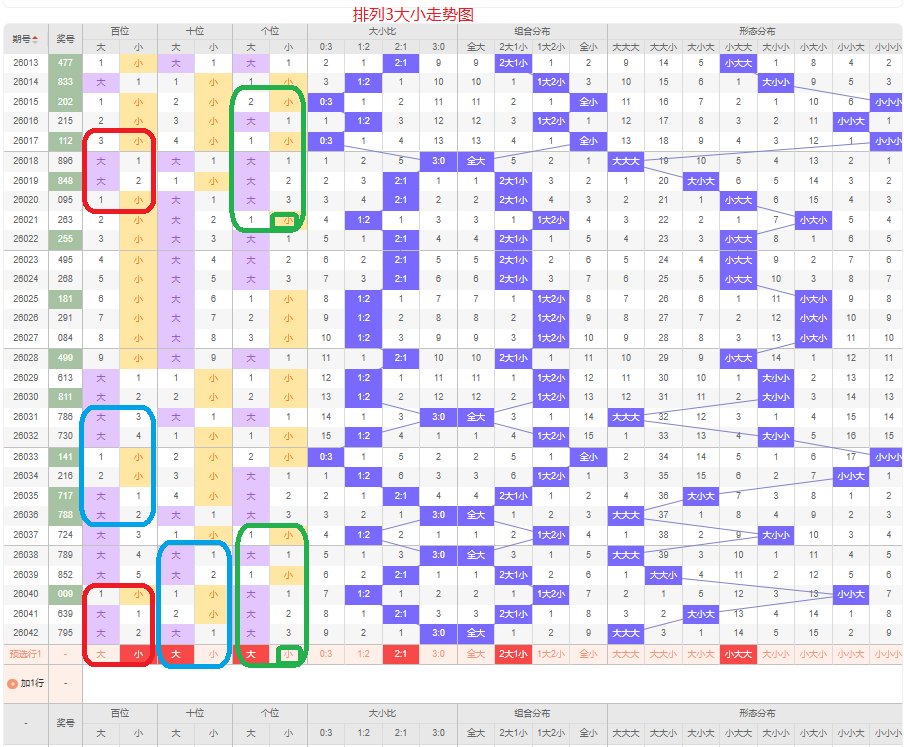排列3第26042期开出的号码795,和值21,跨度4,奇偶比为3:0,大小比为3:0,012路个数比为1:1:1,组六的形态。