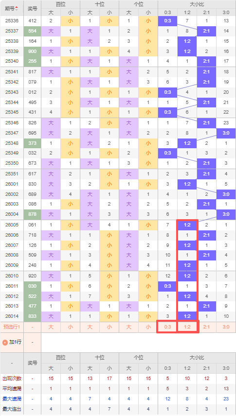 上期大小比:1:2,近10期大小比出现情况:1:2、2:1、1:2、2:1、1:2、1:2、0:3、1:2、2:1、1:2,最近10期出3期2:1,出现6期1:2,出现1期0:3,出现0期3:0,根据近10期出号规律本期推荐连出1:2,防遗漏3期出0:3,综上所述大小比推荐:防:0:3,重点关注:1:2。