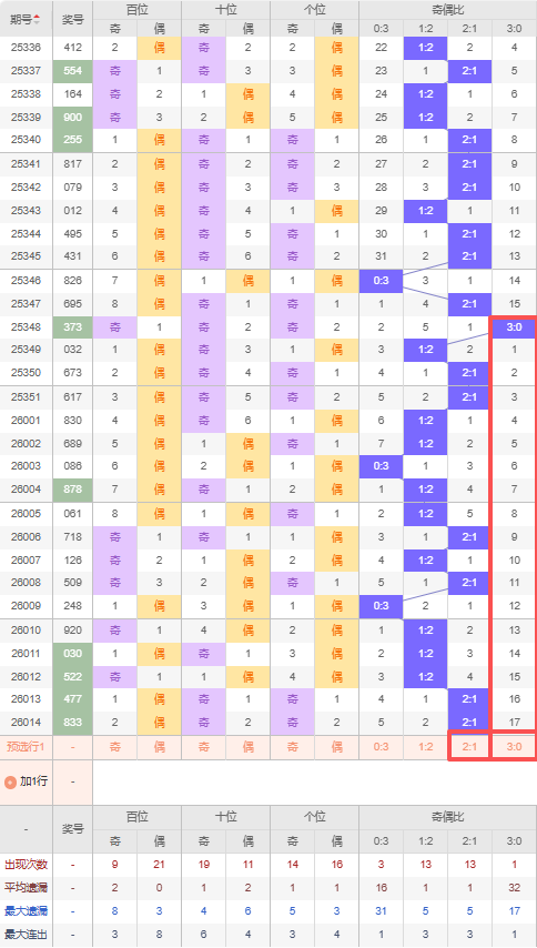 上期奇偶比:2:1,近10期奇偶比出现情况:1:2、2:1、1:2、2:1、0:3、1:2、1:2、1:2、2:1、2:1,最近10期出现4期2:1,出现5期1:2,出现1期0:3,出现0期3:0,根据近10期出号规律本期推荐遗漏17期出3:0,防三连出2:1,综上所述奇偶比推荐:防:2:1,重点关注:3:0。