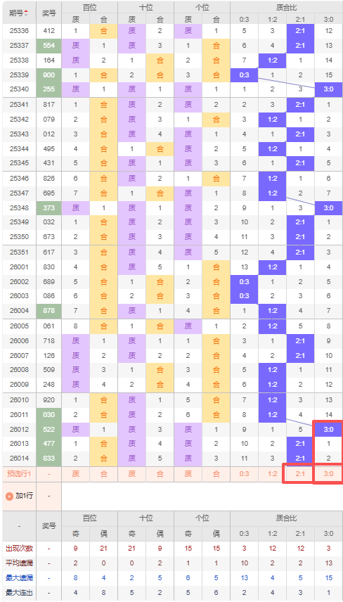 上期质合比:2:1,近10期质合比出现情况:1:2、2:1、2:1、1:2、1:2、1:2、1:2、3:0、2:1、2:1,最近10期出现4期2:1,出现5期1:2,出现0期0:3,出现1期3:0,根据近10期规律本期推荐遗漏2期出3:0,防三连出2:1,综上所述质合比推荐:防:2:1,重点关注:3:0。