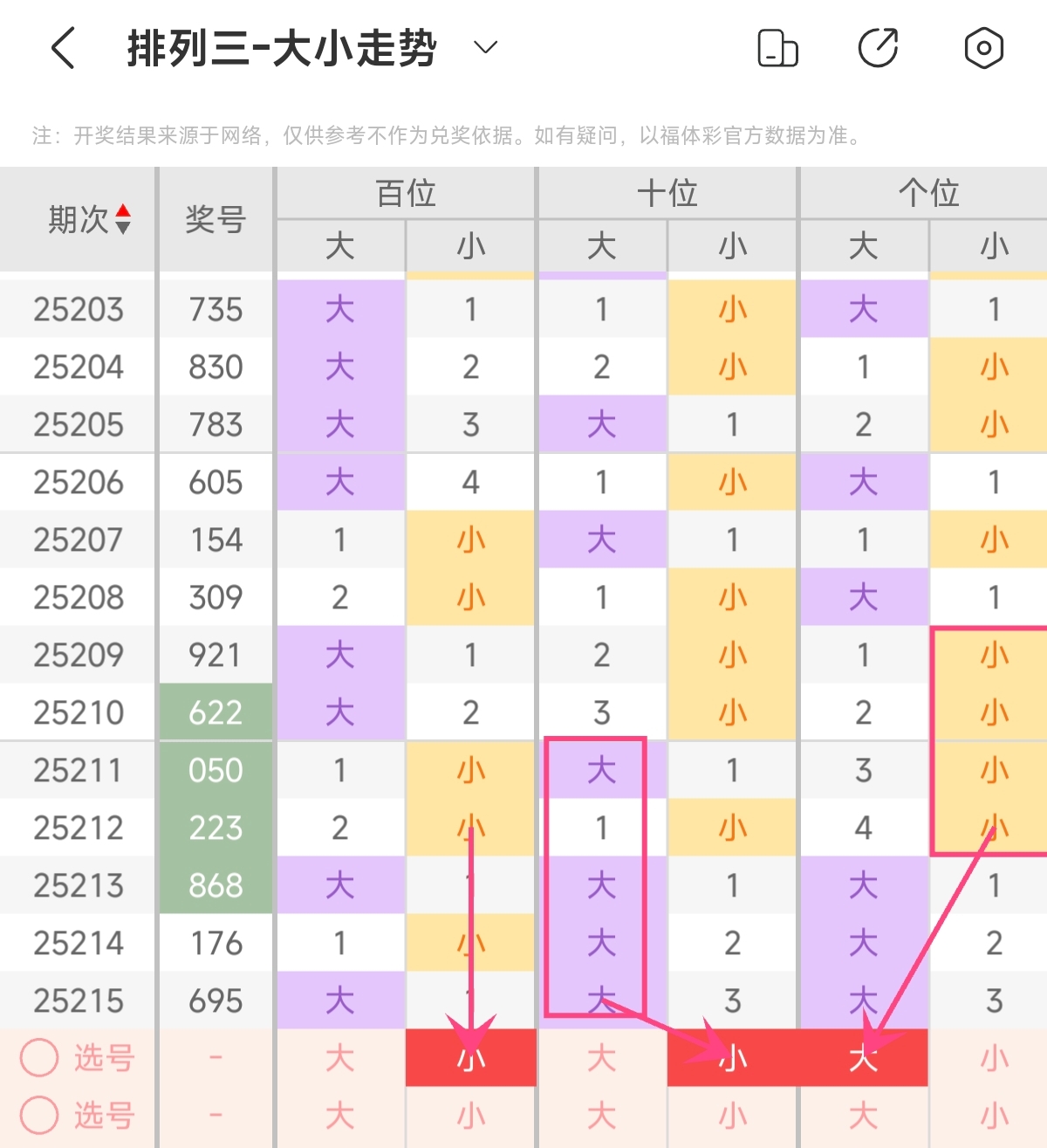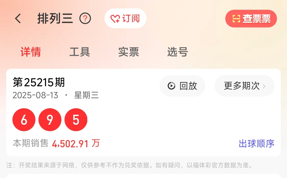 首先让我们回顾一下上期排列3第2025215期开奖号码为695,为组六形态,大小比为3:0,奇偶比为2:1,和值为20,跨度为4。