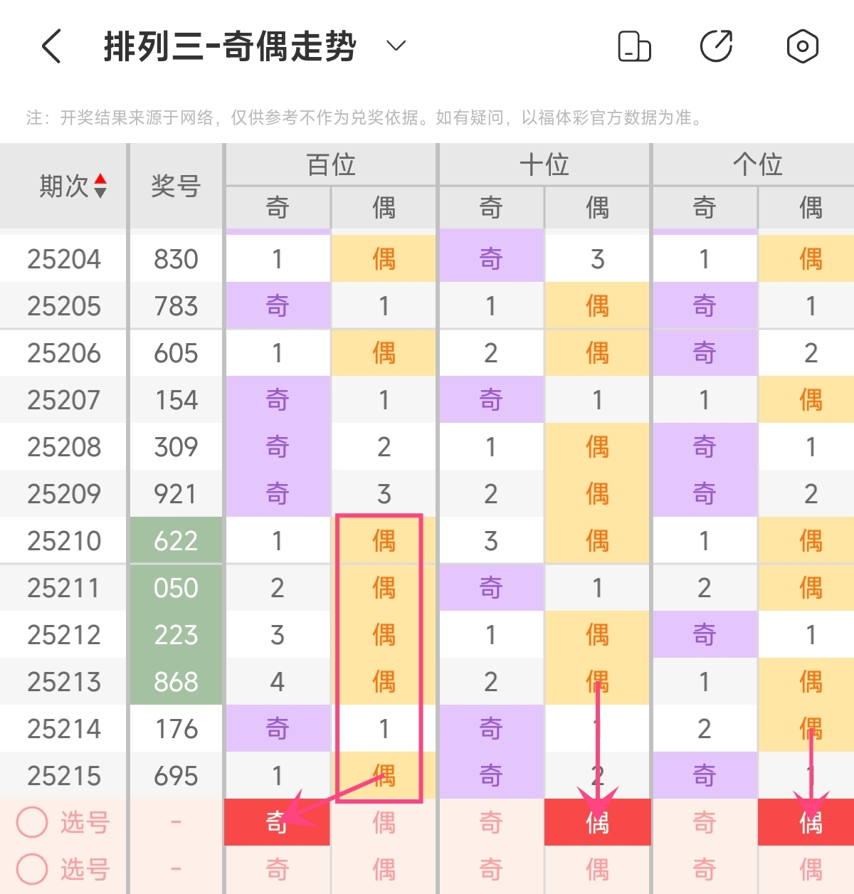 预计本期会回补偶数号码,本期可关注奇偶比1:2,偶数占优组合 。本期奇偶形态可重点关注:奇偶偶。