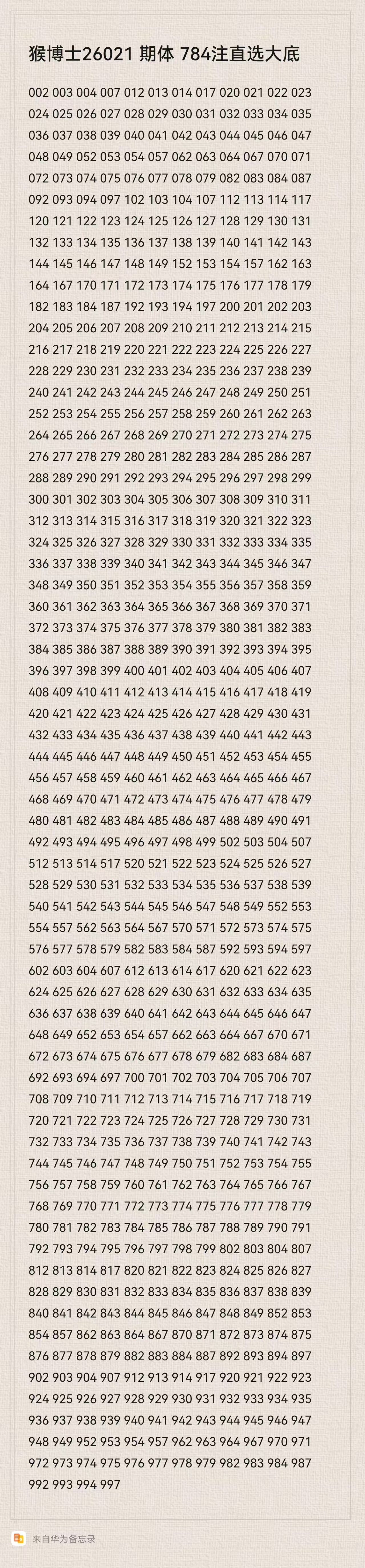 猴博士26021期排列三784注直选大底:(可以当母底用,然后进行缩水)