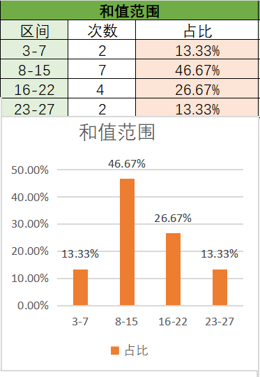 上期和值为16,处在16~22之间,其中16~22占比变大,3~7占比变小目前最热门是8~15,次之是16~22,然后是23~273~7。上期和值为16,本期看好和值在8~15之间,其次是16~22