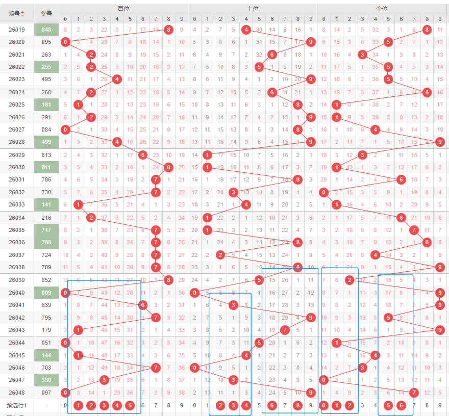 百位:百位开号上期开出了0号球,振幅变小,从开号趋势上来看,本期比较看好左边和中间的号码;从奇偶情况来看,最近是奇数占优,本期看好奇数;从012路来看,上期开出了0路号码,近期基本是01路最热门,本期看好开1路,其次是2路,最后0路;