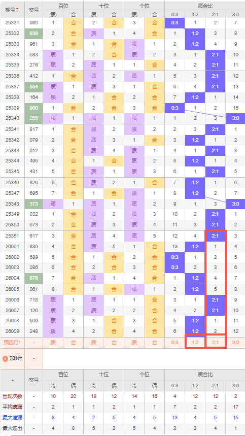 上期质合比:1:2,近10期质合比出现情况:2:1、1:2、0:3、0:3、1:2、1:2、2:1、2:1、1:2、1:2,最近10期出现3期2:1,出现5期1:2,出现2期0:3,出现0期3:0,根据近10期规律本期推荐三连出1:2,防遗漏2期出2:1,综上所述质合比推荐:防:2:1,重点关注:1:2。