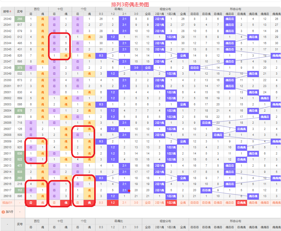 上一期的奇偶比为1:2,两偶的号码组合,从近五期的奇偶数出现情况看,奇数出7次,偶数出现8次,奇数偶数号码出现较平均,本期要侧重两偶的号码组合,侧重奇偶偶或奇偶奇的号码组合,根据奇偶组合形态可做五码定位13579/02468/02468或13579/02468/13579
