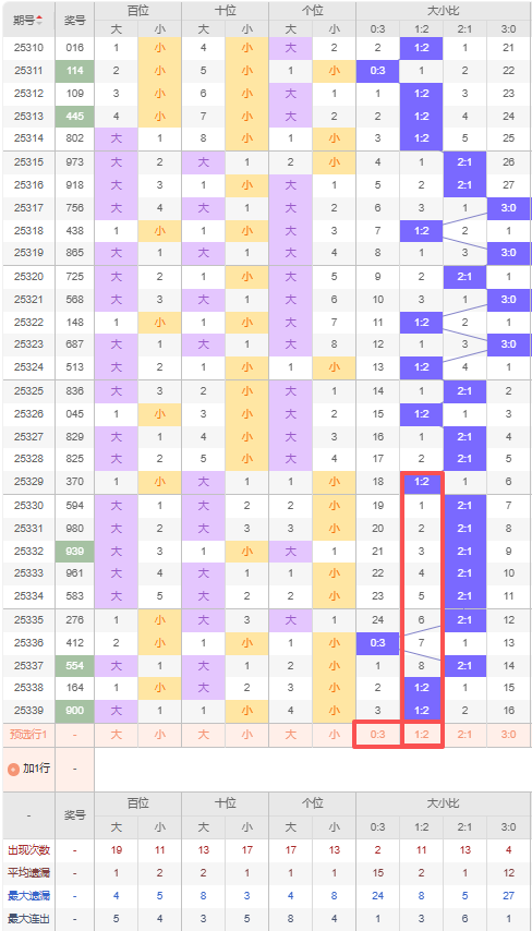 上期大小比:1:2,近10期大小比出现情况:2:1、2:1、2:1、2:1、2:1、2:1、0:3、2:1、1:2、1:2,最近10期出7期2:1,出现2期1:2,出现1期0:3,出现0期3:0,根据近10期出号规律本期推荐遗漏3期出0:3,防三连出1:2,综上所述大小比推荐:防:1:2,重点关注:0:3。