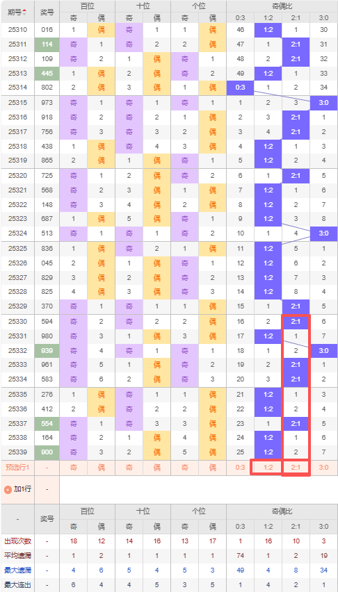 上期奇偶比:1:2,近10期奇偶比出现情况:2:1、1:2、3:0、2:1、2:1、1:2、1:2、2:1、1:2、1:2,最近10期出现4期2:1,出现5期1:2,出现0期0:3,出现1期3:0,根据近10期出号规律本期推荐三连出1:2,防遗漏2期出2:1,综上所述奇偶比推荐:防:2:1,重点关注:1:2。
