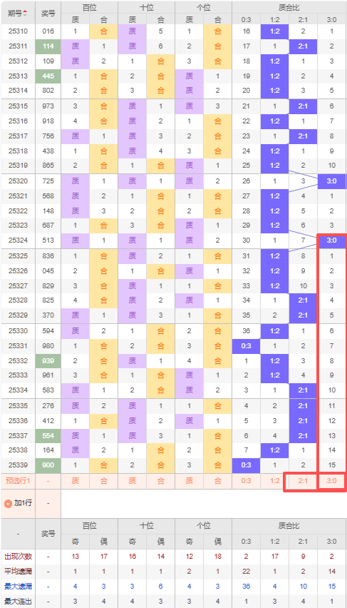 上期质合比:0:3,近10期质合比出现情况:1:2、0:3、1:2、1:2、2:1、2:1、2:1、2:1、1:2、0:3,最近10期出现4期2:1,出现4期1:2,出现2期0:3,出现0期3:0,根据近10期规律本期推荐遗漏2期的2:1,防遗漏15期的3:0,综上所述质合比推荐:防:3:0,重点关注:2:1。