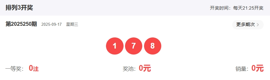 排列三第2025250期开奖回顾:开奖号码:178 形态:组六
