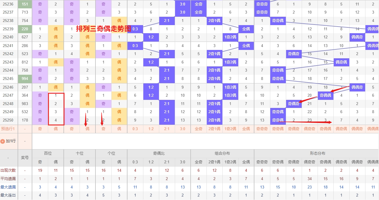 排列三 奇偶分析:从上图可以看出排列三100期内百位奇偶比约为45比55,十位奇偶比为47比53,个位奇偶比为49比51,个位的比值比较均衡,但是百位的比值偏差就有点大,历史奇偶形态近2期开出奇奇偶后下一期的走势为,第174期开出奇奇偶后175期开偶偶偶, 第181期开出奇奇偶后第182期开偶偶奇,第193期开出奇奇偶后第194期开偶奇奇,近期排列三奇偶走势中,偶偶奇和偶偶偶组合持续活跃,形成明显的热态趋势,尤其是偶偶奇组合近期连开频率较高,且偶偶偶形态同样呈现密集出号特征。从奇偶分布的历史规律来看,此类热号形态往往具有短期延续性,需重点关注其连开潜力。另一方面,偶奇奇组合已长期处于低温冷寂状态,遗漏值逐步扩大,冷号回补的动能逐渐积累。结合奇偶走势的周期性特点,冷态组合通常会在热号极端偏态后出现阶段性反弹。所以排列三2025251期奇偶形态推偶奇奇与偶偶奇。