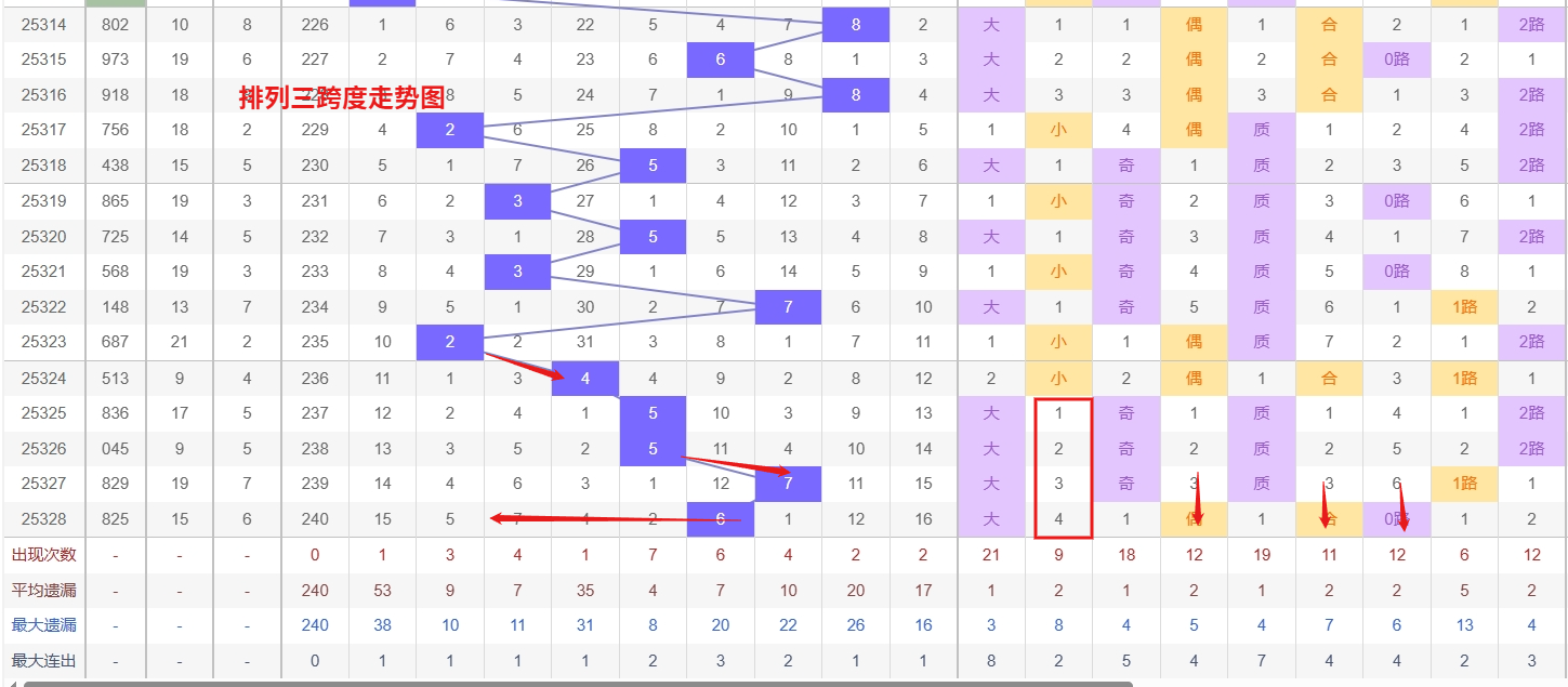 排列三 跨度分析:从上图可以看出近100期的跨度大小比约为54比46,跨度奇偶比约为49比51总体来看还是比较均衡的,但跨度大小之间有点差异。我们再从历史开出6跨后下一期3跨度数据来做参考。最近10期跨度大小比约为5:5期开出小数跨度过多返回大数跨度的概率更高一点。历史开奖近2期出6跨以后的走势为252期开出6跨后下一期走3跨走出3振幅,第274期开出6跨后下一期走1跨走出5振幅第285期开出6跨后下一期开出9跨走出3个振幅。连续多期大振幅,排列三跨度近期走势来看,3跨作为当前热号表现非常强势,呈现出明确的活跃态势,且历史上跨度走热后常有延续现象,因此需重点防范3跨连下或持续走热的可能。与此同时,1跨在组三形态中已连续多期未见踪迹,处于明显的遗漏状态,而组三本身在间隔较长后回补的概率会逐步积累,考虑到1跨在组三形态中具有一定的出号特征,其与组三组合回补的可能性不容忽视。综合来看,跨度走势在热号持续发力的同时,也需警惕冷态组合的突然回归,在跟进3跨热势的同时,对1跨伴随组三出现的可能性做好防守准备,本期预计跨度遵从历史会走出大振幅,出6跨度后容易走出2到5个跨度振幅的对称形态,跨度走出2到5个振幅看好的跨度有1349跨,所以第2025329期排列三跨度推荐1349跨。本文由一起彩钱是生命动力所著,请勿转载