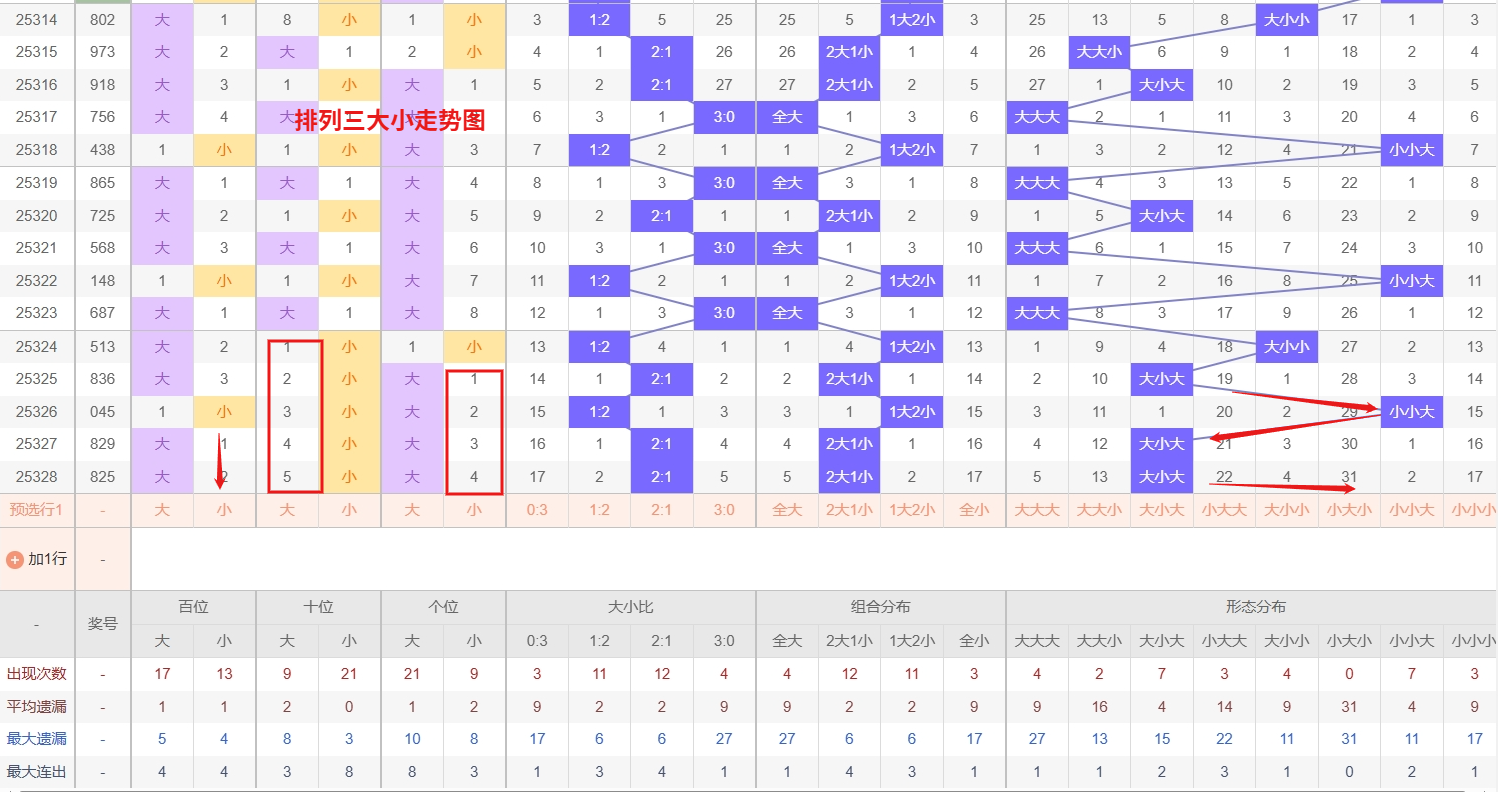 排列三 大小形态分析:从大小走势图上可以看出排列三100期内百位大小比约为52比48,十位大小比约为47:53,个位大小比约为54比46,除了个位和百位奇数比偶数多,十位是偶数比奇数多。历史数据近2期开出大小大下一期的走势为,第244期开出大小大第245期开小小小。第272期开出大小大后第273期开小大大,第295期开出大小大后296期开小大小。排列三大小走势来看,近期“小大大”与“小小小”两种形态虽处于温态区间,但其出号频率呈现稳步上升的态势,尤其是间隔周期逐渐缩短,显示出较为明确的转热迹象。这种温中有升的走势往往预示着形态即将进入活跃阶段,需重点防范其短期内加速出号或轮动走热的可能。与此同时,大小形态的冷热转换常呈现出“温态先行、热态跟进”的规律,所以排列三第2025329期大小形态推荐小大大防小小小。本文由一起彩钱是生命动力所著,请勿转载