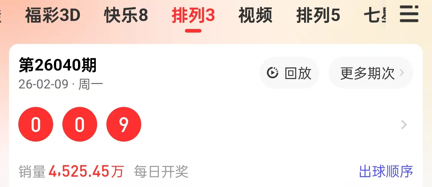 2026年2月9日开奖号码为 0,0,9,对应参数如下: