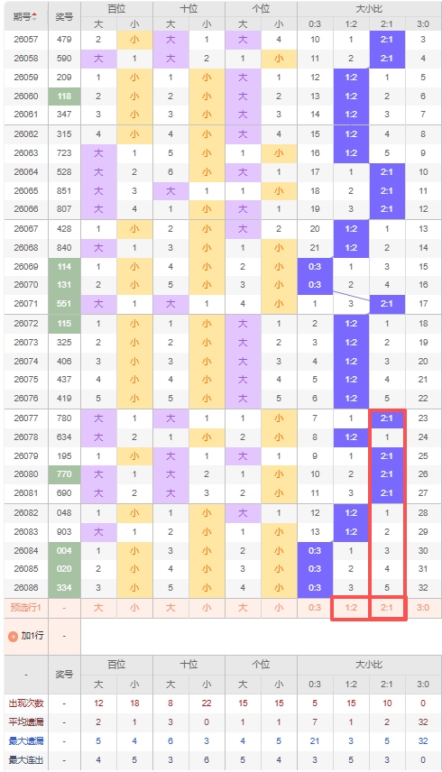 上期大小比:0:3,近10期大小比出现情况:2:1、1:2、2:1、2:1、2:1、1:2、1:2、0:3、0:3、0:3,最近10期出4期2:1,出现3期1:2,出现3期0:3,出现0期3:0,根据近10期出号规律本期推荐遗漏5期出2:1,防遗漏3期出1:2,综上所述大小比推荐:1:2,重点关注:2:1。