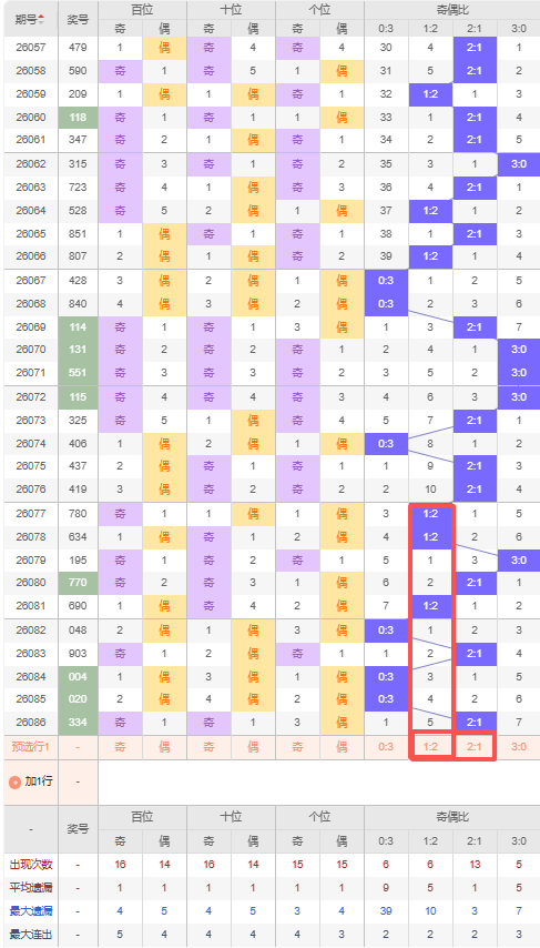 上期奇偶比:2:1,近10期奇偶比出现情况:1:2、1:2、3:0、2:1、1:2、0:3、2:1、0:3、0:3、2:1,最近10期出现3期2:1,出现3期1:2,出现3期0:3,出现1期3:0,根据近10期出号规律本期推荐遗漏5期出1:2,防连出2:1,综上所述奇偶比推荐:2:1,重点关注:1:2。