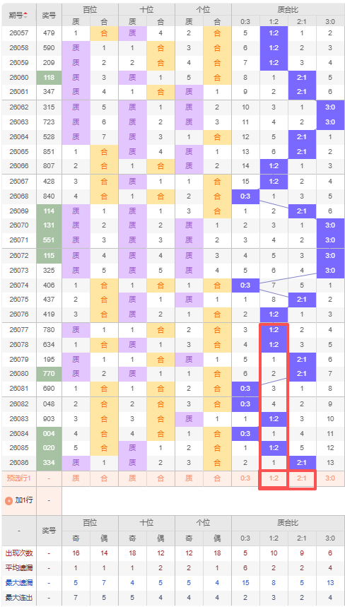 上期质合比:2:1,近10期质合比出现情况:1:2、1:2、2:1、2:1、0:3、0:3、1:2、0:3、1:2、2:1,最近10期出现3期2:1,出现4期1:2,出现3期0:3,出现0期3:0,根据近10期规律本期推荐隔期的1:2,防连出2:1,综上所述质合比推荐:2:1,重点关注:1:2。