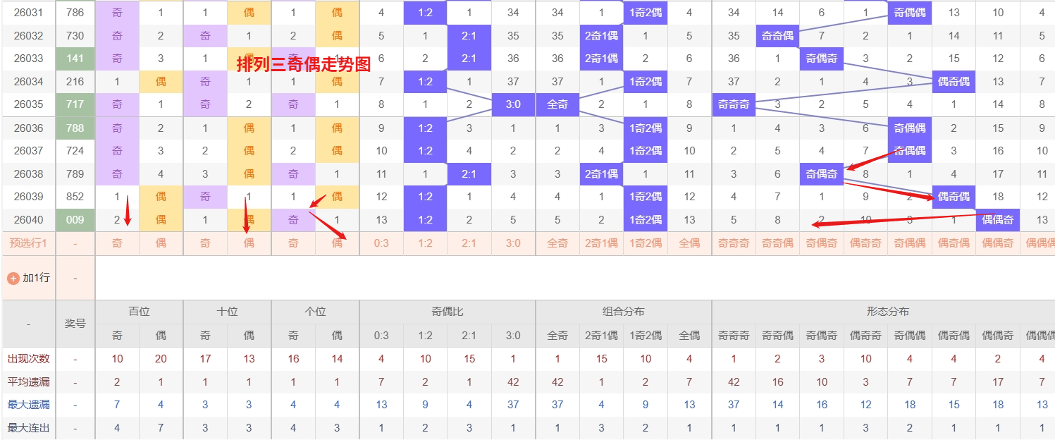 排列三 奇偶分析:从上图可以看出排列三100期内百位奇偶比约为47比53,十位奇偶比为46比54,个位奇偶比为51比49,个位的比值比较均衡,但是十位的比值偏差就有点大,历史奇偶形态近2期开出偶偶奇后下一期的走势为,第314期开出偶偶奇后315期开奇奇偶, 第335期开出偶偶奇后第336期开奇偶偶,第342期开出偶偶奇后第343期开偶偶偶,排列三近期的奇偶走势来看,形态“奇奇偶”已经历较长周期的遗漏,逐渐进入冷态区间,根据奇偶分布的概率均衡特性,该形态的回补压力正不断累积,技术上存在较强的反弹需求,值得近期关注其解冻信号。而形态奇偶偶则持续多期活跃,表现出明确的热态特征,在热态惯性未明显减弱前,防范其继续开出的可能。综合而言,当前阶段适宜采取冷热兼顾的策略:在跟踪奇奇偶冷态回补机会的同时,需对奇偶偶这一热态形态保持防守,所以排列三2026041期偶奇奇形态推奇偶偶与奇奇偶。