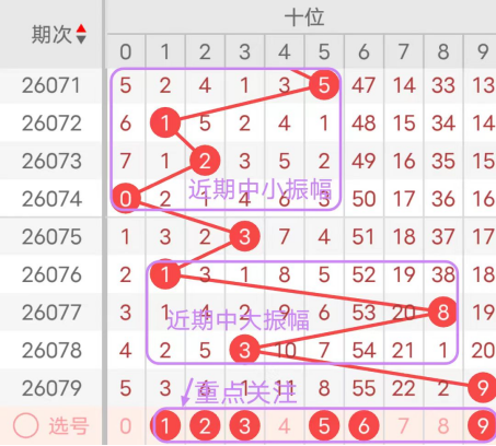 7期(073~079)开奖号十位号码球分别为2、0、3、1、8、3、9,开奖号与上一期走出的振幅分别为1、2、3、2、7、5、6。073期走出2号小数号码球,走出“1”的小幅度,074期走出0号小数号码球,走出“2”的小幅度,075期走出3号中小数号码球,走出“3”的中小幅度,076期走出1号小数号码球,走出“2”的小幅度,077期走出8号大数号码球,走出“7”的大幅度,078期走出3号中小数号码球,走出“5”的中大幅度,079期走出9号大数号码球,走出“6”的中大幅度;从振幅大小及走势图的整体对应来看,中大振幅走在6~8之间较为适宜,中小振幅走在0~4之间较为适宜;结合走势图的上下对应及振幅大小分析,本期十位应重点关注号码球为1、2、3、56、9。