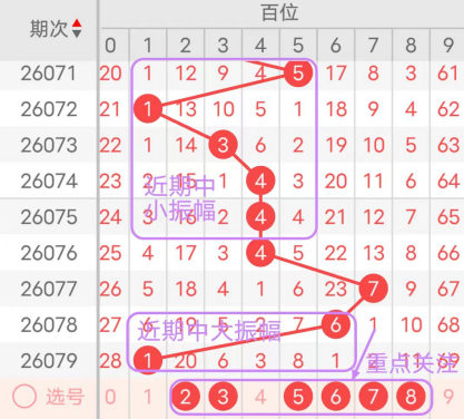 7期(073~079)开奖号百位号码球分别为3、4、4、4、7、6、1,开奖号与上一期走出的振幅分别为2、1、0、0、3、1、5。073期走出3号中小数号码球,走出“2”的小幅度,074期走出4号中小数号码球,走出“2”的小幅度,075期走出4号中小数号码球,走出“0”的小幅度,076期走出4号中小数号码球,走出“0”的小幅度,077期走出7号大数号码球,走出“3”的中小幅度,078期走出6号中大数号码球,走出“1”的小幅度,079期走出1号小数号码球,走出“5”的中大幅度;从振幅大小及走势图的整体形势来看,中大幅度走在5~7之间较为适宜,中小幅度走在1~4之间较为适宜;结合走势图的整体及大小走势分析,本期百位需重点关注号码球为2、3、5、6、7、8