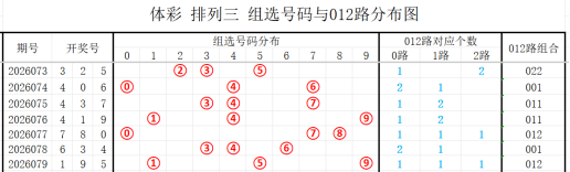 7期(073~079)开奖号与012路组合分别为325(022)、406(001)、437(011)、419(011)、780(012)、634(001)、195(012)上期开奖号为012路组合,根据整体走势分析,本期看好的012路组合有:022、112、012,011、001、002路组合。