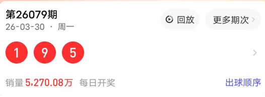 2026079期开奖号码为195,奇偶值为3奇;大小值为21小;012路走势为012路;跨度为8跨;和值15点;组六形态。