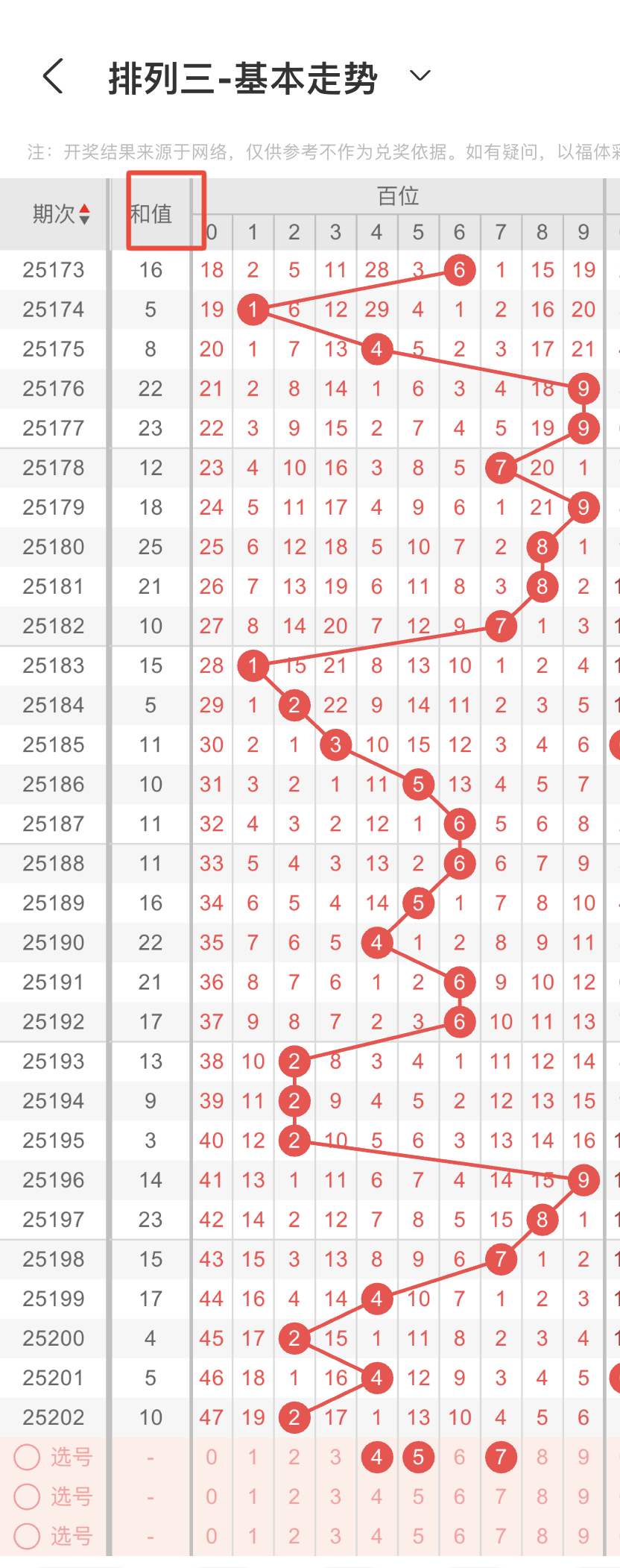 结合上面的大小、奇偶以及012路比,我们可以得到的数据分别是第一组56789,第二组13579,第3组147,我们重点选择3组数据中重复的,那百位我们选择7,防2路的5,1路的4,综上所述百位选457