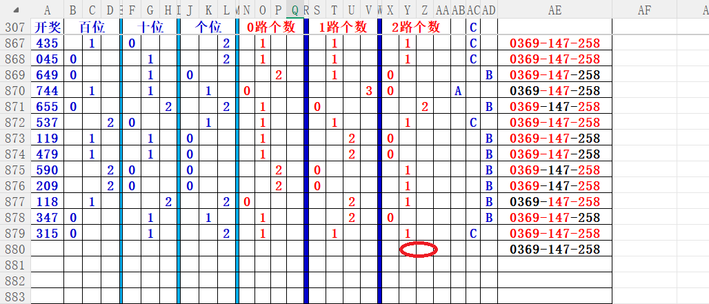 如上图56,012路分析0路出号的概率还是很大,本期可以从0路号入手做胆0369中选;看好369胆码。