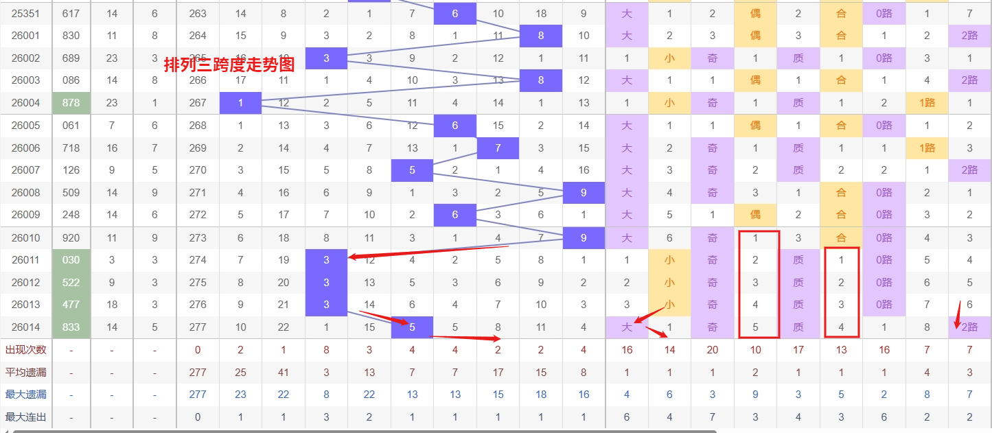 跨度:5 和值:14 大小比:大小小 奇偶形态:偶奇奇