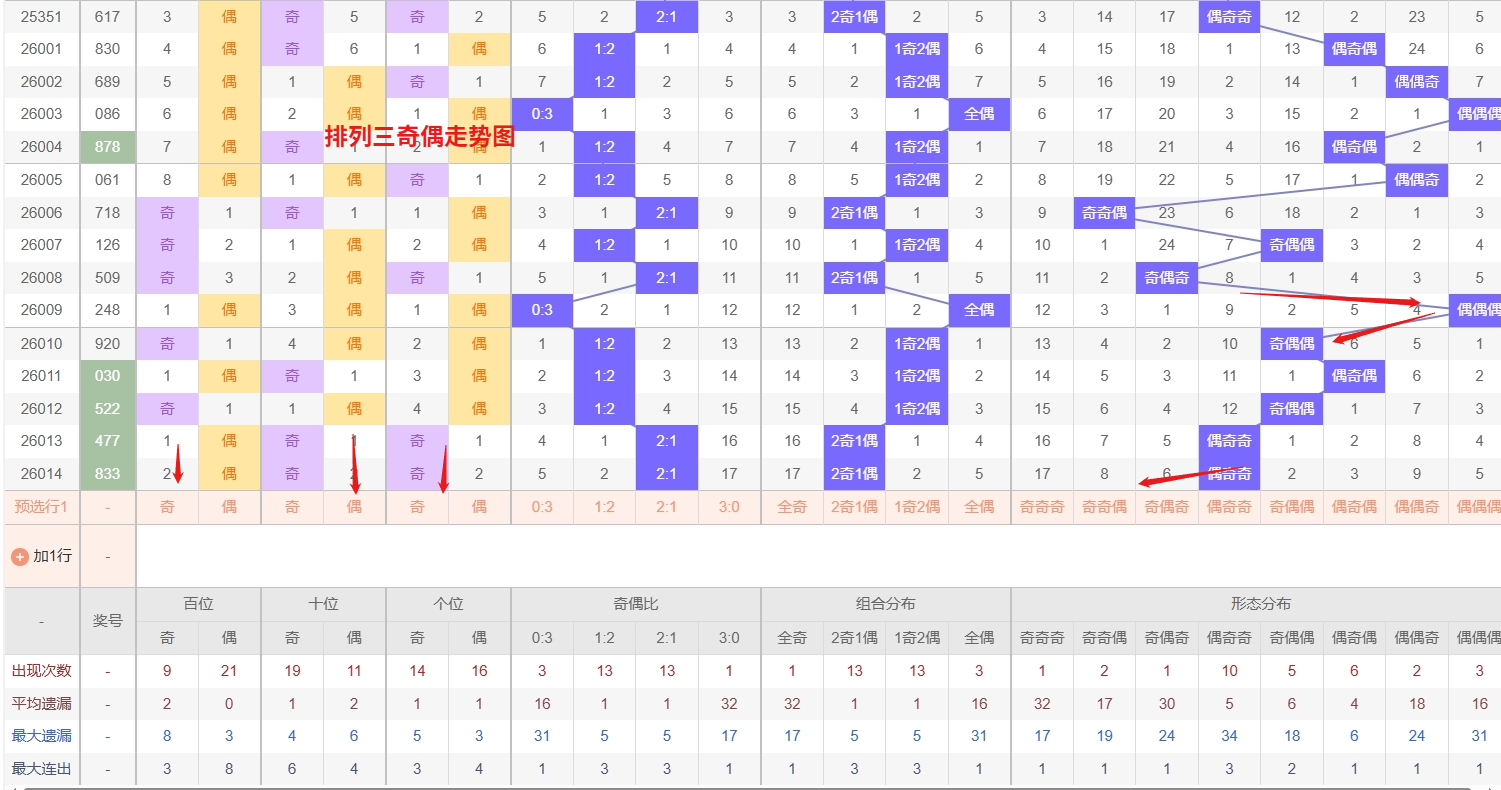 排列三 奇偶分析:从上图可以看出排列三100期内百位奇偶比约为46比54,十位奇偶比为45比55,个位奇偶比为51比49,个位的比值比较均衡,但是百位的比值偏差就有点大,历史奇偶形态近2期开出偶奇奇后下一期的走势为,第284期开出偶奇奇后285期开奇奇偶, 第297期开出偶奇奇后第298期开偶偶偶,第308期开出偶奇奇后第309期开奇偶奇,近期排列三奇偶走势分析,形态“奇奇偶”和“奇偶奇”均已进入偏冷区间,遗漏期数逐步累积,达到了需要警惕回补的临界点。历史数据表明,特定形态在冷态持续一段时间后,往往会通过技术性反弹来平衡整体分布,因此这两种冷态形态近期解冻的可能性正在增加。尽管当前可能以热态形态为主导,但冷态的回补往往具有突发性和连续性,所以排列三2026015期奇偶形态推奇奇偶与奇偶奇。本文由一起彩钱是生命动力所著,请勿转载