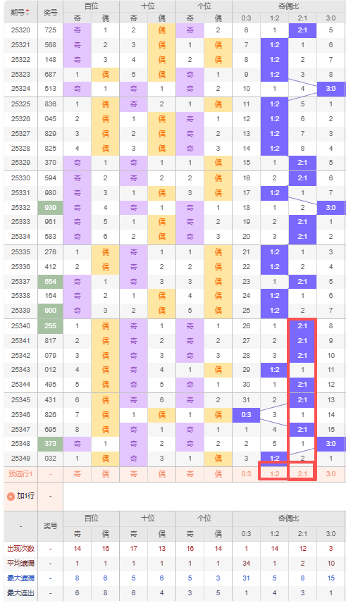 上期奇偶比:1:2,近10期奇偶比出现情况:2:1、2:1、2:1、1:2、2:1、2:1、0:3、2:1、3:0、1:2,最近10期出现6期2:1,出现2期1:2,出现1期0:3,出现1期3:0,根据近10期出号规律本期推荐连出2:1,防遗漏2期出2:1,综上所述奇偶比推荐:防:2:1,重点关注:1:2。