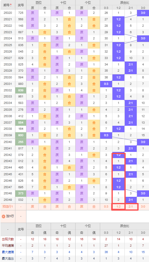 上期质合比:2:1,近10期质合比出现情况:3:0、2:1、1:2、2:1、1:2、2:1、1:2、1:2、3:0、2:1,最近10期出现4期2:1,出现4期1:2,出现0期0:3,出现2期3:0,根据近10期规律本期推荐遗漏2期出1:2,防连出2:1,综上所述质合比推荐:防:2:1,重点关注:1:2。