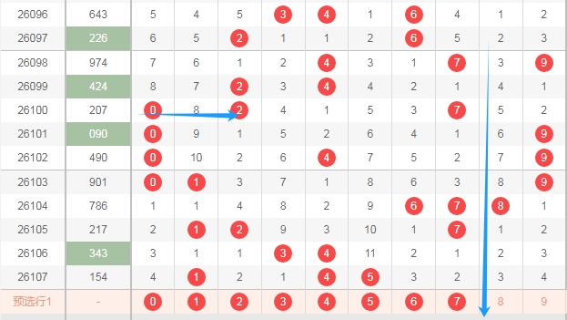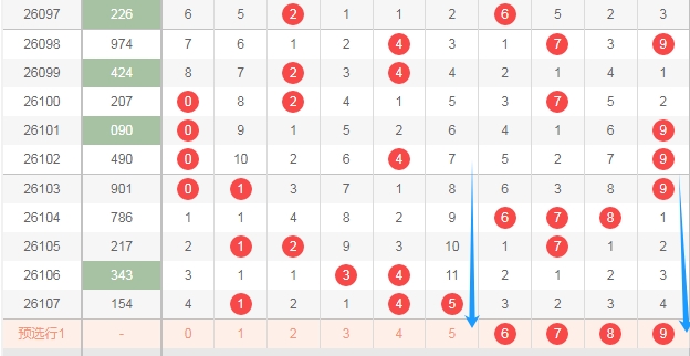 上图是体彩排列三开奖号码走势分布图,我标注出来的蓝色箭头中间这个区域的数字6789连续两期没出现号码,那么本期可以关注这个区域的数字出一个或者两个。