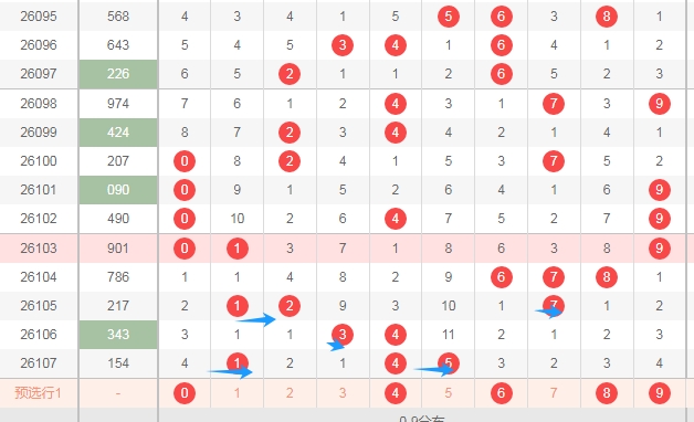上图是体彩排列三开奖号码走势分布图,我标注出来的蓝色箭头表示质数数字,很明显最近3期开出的质数数字多,开出的合数数字少,那么本期合数数字04689可以关注出一个或者两个 ,防出3个吧。