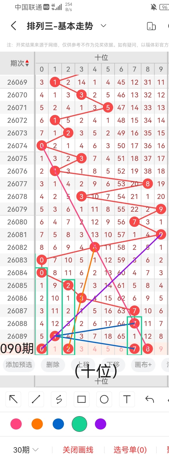 我们参照上图中的画线思路走势可以看出,号码0与前几期开出的号码呈斜三连的走位且呈隔两期回补的走势;号码2与前几期开出的号码呈斜三连的走势且呈直连回补的走位;号码4与前几期开出的号码呈连续隔期回补的走位且呈斜三连的走势;号码5与前几期开出的号码呈斜三连的走势且呈隔十期回补的走位;号码8与前几期开出的号码呈斜三连的走位且呈隔七期回补的走势。