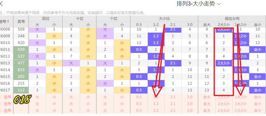 观察号码分布图,10期号码30个数字,小号占优势,整体趋于偏小号(0–4)共出现16次,大号(5–9)共出现8次。接来应该是一个转换期,