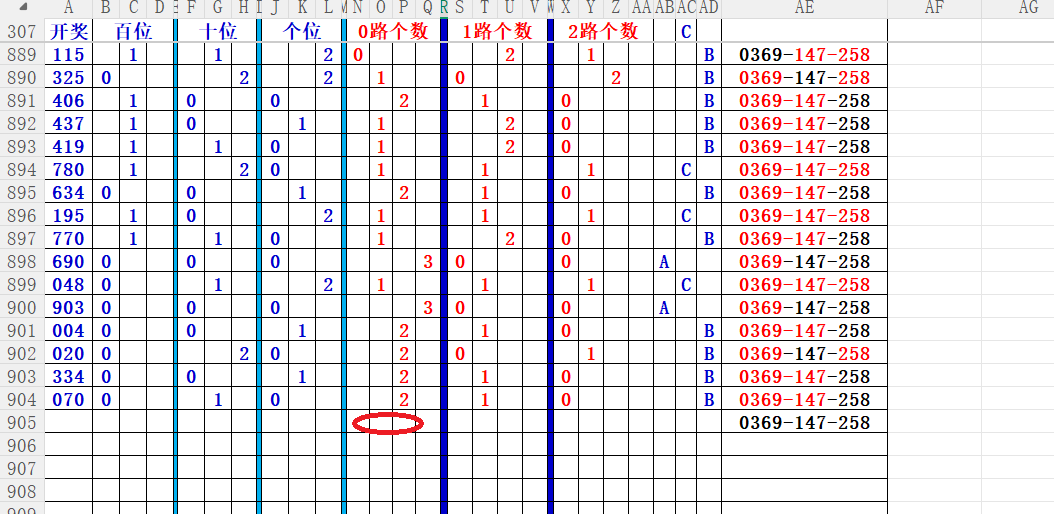 如上图56,012路分析0路出号的概率还是很大,本期可以0路号入手做胆0369中选;看好369胆码