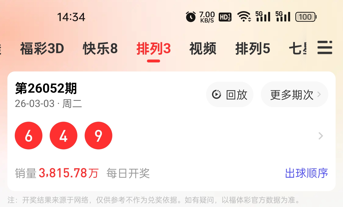 最新一期排列三(2026052期,2026年3月3日)开奖号码为:6、4、9。
