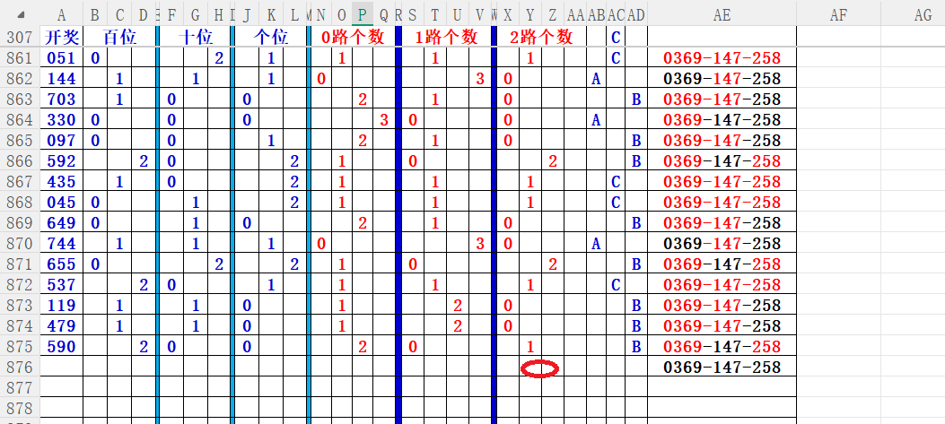 如上图56,012路分析0路出号的概率还是很大,本期可以从0路号入手做胆0369中选;看好369胆码。