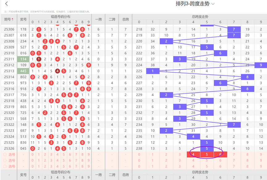 通过观察跨度及跨度属性走势可以发现:近10期内跨度较少开出019等号码,本期跨度开出019等号码的可能性小,因此本期跨度选号时可以优先排除019等号码,再结合上述走势图看,本期跨度看好456等号码。