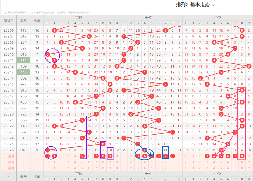 上一期百位开出号码为0,为偶数、小数、合数、0路号码:近10期百位26等号码较少出号,本期百位大概率仍然不会开出26等号码,因此本期百位选号时应该考虑26以外的号码,结合上述走势图看,本期百位看好015789等号码。