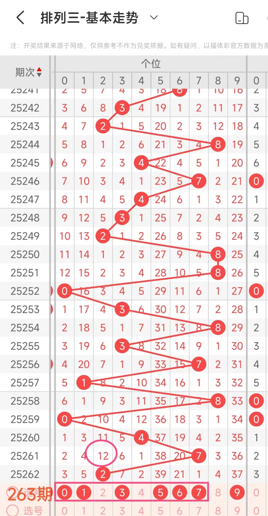 历史上开出512的共有6次分别为2009176期、2014345期、2015130期、2019092期、2025262期等(其它期数详见彩虹走势图)。他们追随的号码统计如下:其中0到9数字出现次数分别为:0号出现2次、1号出现0次、2号出现4次、3号出现0次、4号出现2次、5号出现3次、6号出现0次、7号出2次、8号出现1次、9号出现1次.观察得到2号出现4次最多,然后是5号,以上数字本期可以考虑一下。而和值4 6 12 18出现1次本期也要关注一下!而合尾 2出现2次重点看一下.,跨度34出现2次也要关注一下。