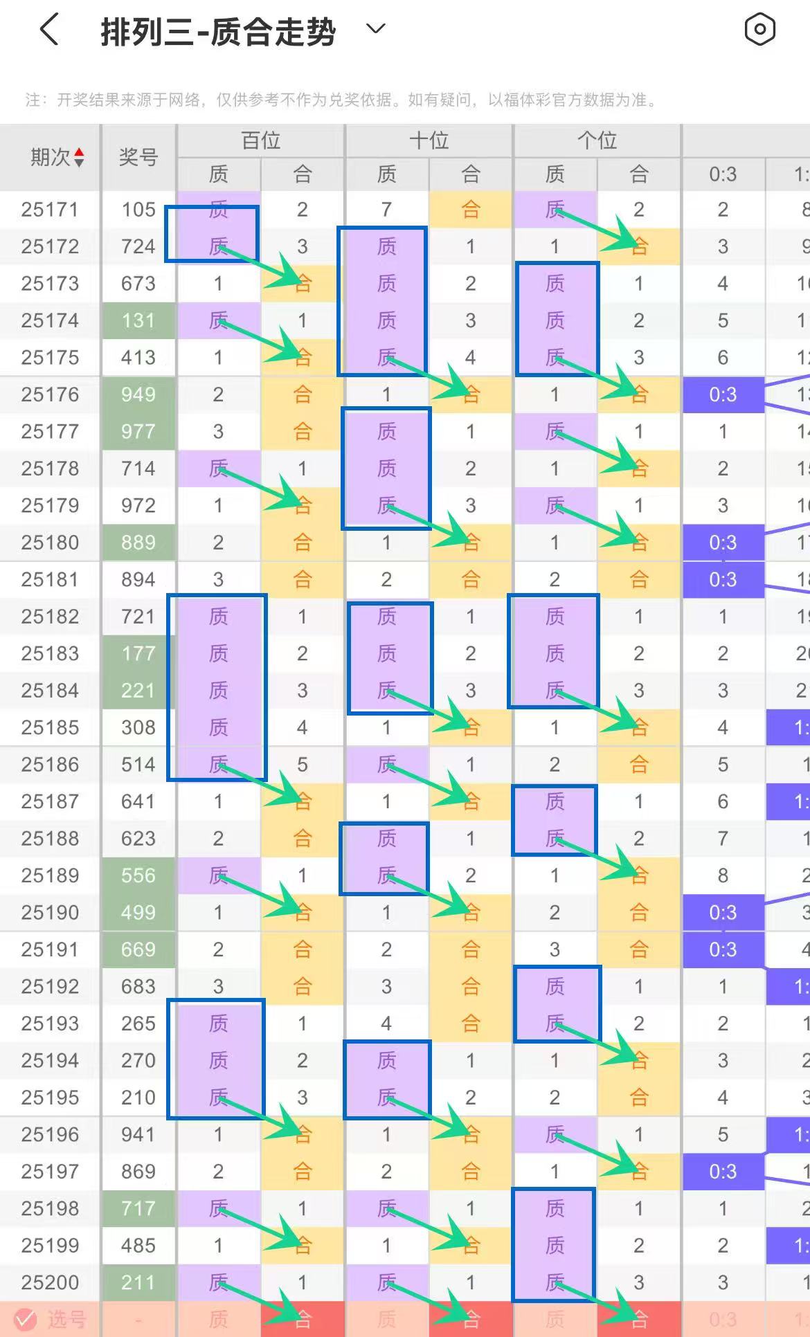 根据上期开出回补质数分析,百位质数与合数呈现交替态势,质数连下情况时有出现,方框标记的连下阶段显示出其在特定时段的集中表现,连下后常通过箭头回补,表明质数在中断后具备较强的再次活跃能力,合数则多以间歇性回补为主,在质数连下的间隙中穿插出现,二者相互制衡,使得百位质合走势未出现长时间的单一主导局面,保持着相对均衡的交替节奏,本期参考回补合数(04689)