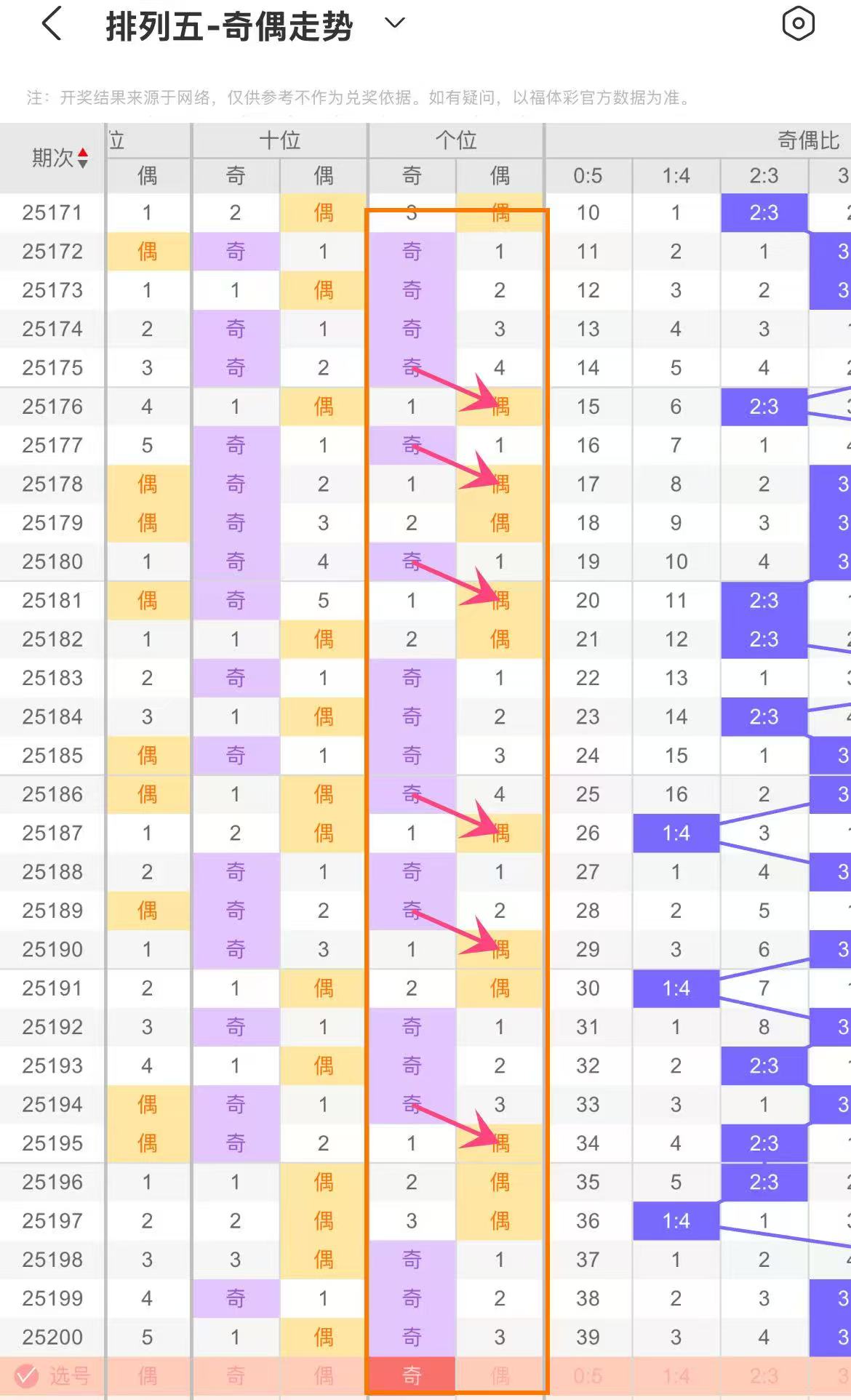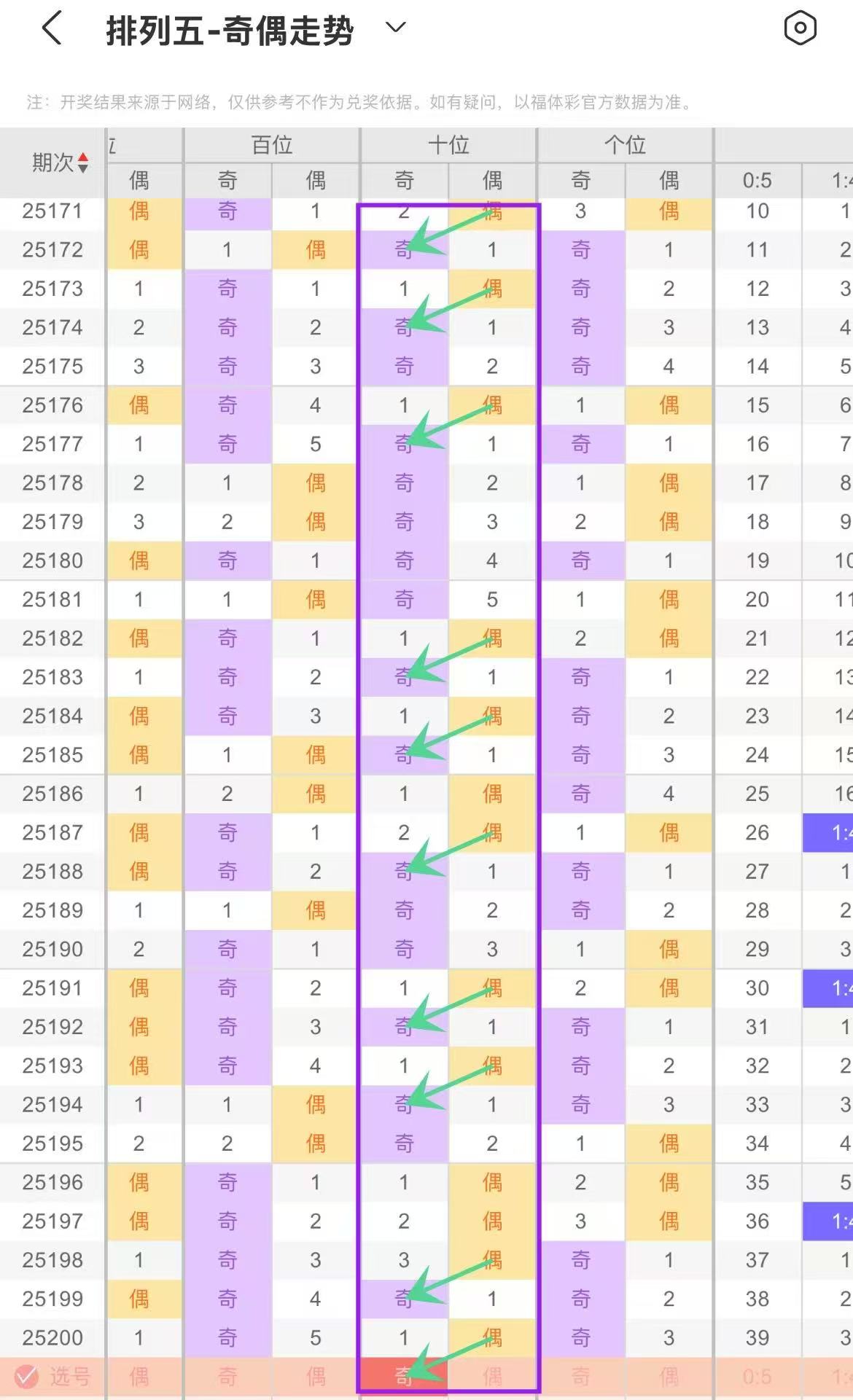 根据上图排列五十位奇偶形态分析,奇数连下特征显著,紫色方框标记出多次连续奇数阶段,展现较强主导性,期间偶数借箭头回补,在奇数连下中断时切入,不过整体出现频率低于奇数,回补箭头成为连接奇偶交替的纽带,让十位走势呈现奇数连下偶数回补循环节奏,虽奇数主导明显,但偶数适时回补维持动态平衡,本期参考回补奇数(13579)