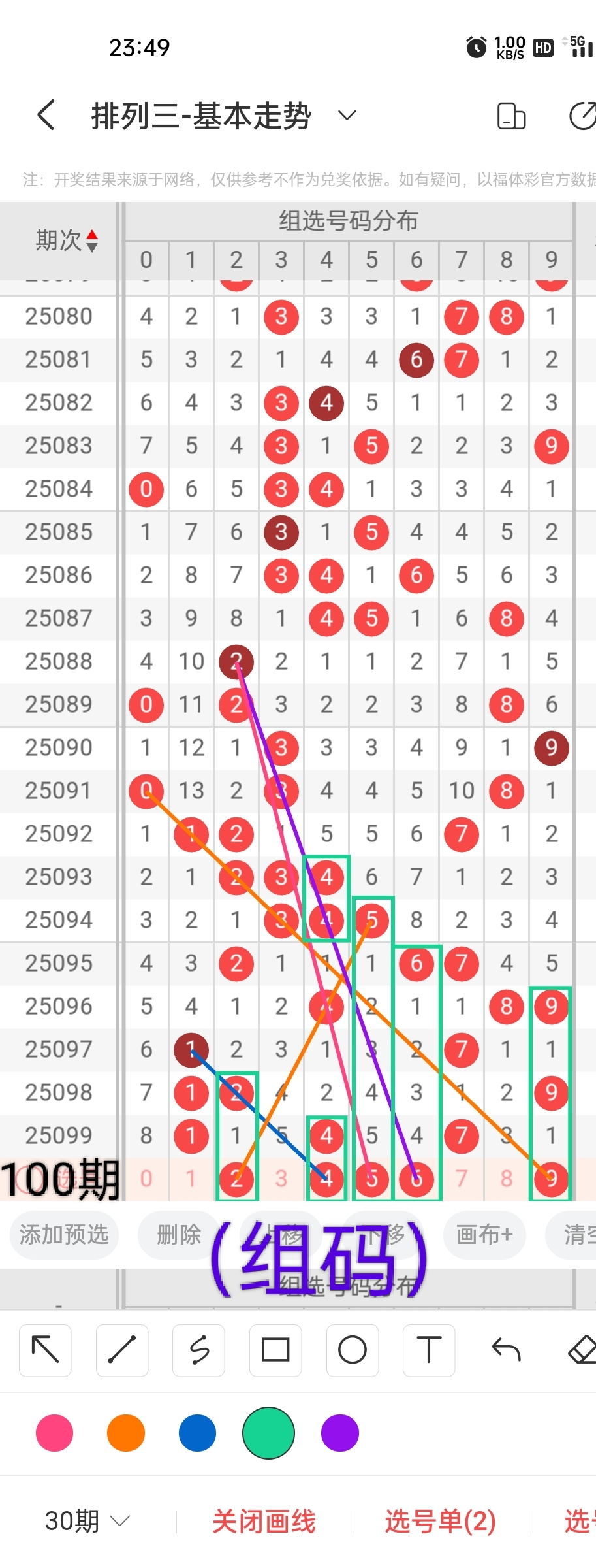 首先,小梁给大家分享一个体彩排列三杀百位的小技巧,期尾号乘以3加3后取个位杀本期百位,正确率高达95.36%。根据这个小技巧,本期杀百位:3。其次,我们根据图中画线的思路可以看出,号码2与前几期开出的号码呈隔十期回补的走势且呈斜三连的走位,跨度为1;号码5与前几期开出的号码呈隔五期回补的走势且呈斜三连的走位,跨度为4;号码8与前几期开出的号码呈斜三连的走位且呈隔八期回补的走势,跨度为7;需关注一下。然后,如图所示,号码9与前几期开出的号码呈斜连的走势且呈隔三期回补的走位,跨度为8。综上所述,小梁预测百位开出的号码为2、5、8、9。
