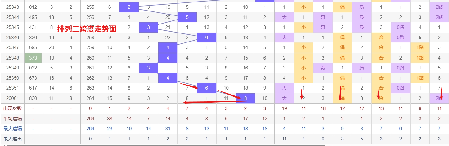 排列三 跨度分析:从上图可以看出近100期的跨度大小比约为51比49,跨度奇偶比约为45比55总体来看还是比较均衡的,但跨度大小之间有点差异。我们再从历史开出8跨后下一期5跨度数据来做参考。最近10期跨度大小比约为4:6期开出小数跨度过多返回大数跨度的概率更高一点。历史开奖近2期出8跨以后的走势为276期开出8跨后下一期走5跨走出3振幅,第282期开出8跨后下一期走4跨走4振幅第307期开出8跨后下一期开出2跨走出6个振幅。连续多期大振幅,近期排列三跨度走势来看,跨5表现活跃,持续走热,呈现出明显的强势状态,短期内继续开出的可能性较高,存在连下的潜力,值得重点跟进。与此同时,跨度2已遗漏多期,陷入深度冷态,从概率平衡与冷号回补规律来看,此类冷跨度往往在持续低迷后突然转暖,需警惕其突袭打破现有热态格局。因此,在追踪热跨5为主线,对冷跨2设置防守,本期预计跨度遵从历史会走出大振幅,出8跨度后容易走出1到5个跨度振幅的对称形态,跨度走出1到5个振幅看好的跨度有2457跨,所以第2026002期排列三跨度推荐2457跨。