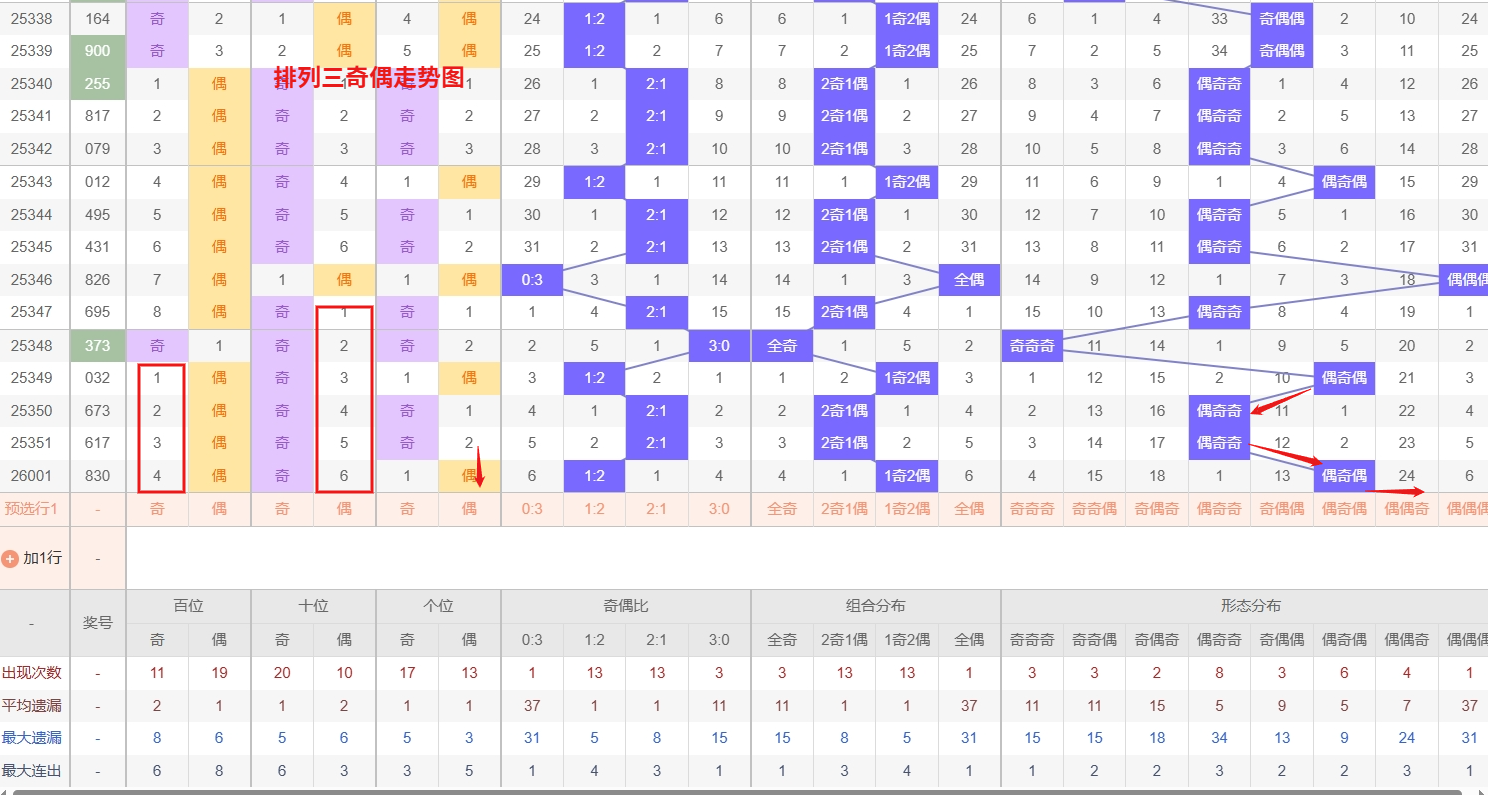 排列三 奇偶分析:从上图可以看出排列三100期内百位奇偶比约为52比48,十位奇偶比为55比45,个位奇偶比为53比47,百位的比值比较均衡,但是十位的比值偏差就有点大,历史奇偶形态近2期开出偶奇偶后下一期的走势为,第273期开出偶奇偶后274期开奇偶奇, 第281期开出偶奇偶后第282期开偶偶奇,第292期开出偶奇偶后第293期开偶偶偶,近期排列三奇偶走势来看,偶偶奇组合持续走热,表现极为活跃,显示出较强的趋势惯性,短期内仍有延续的可能,值得作为关注重点。与此同时,奇偶奇已长期遗漏,陷入明显冷态,从走势均衡与概率回补的角度分析,冷态组合往往在沉寂多期后迎来反弹,其突然转暖的可能性正在逐渐累积,因此,在跟踪偶偶奇这一热号趋势的同时,对奇偶奇的冷号回补保持警惕,所以排列三2026002期奇偶形态推奇偶奇与偶偶奇。