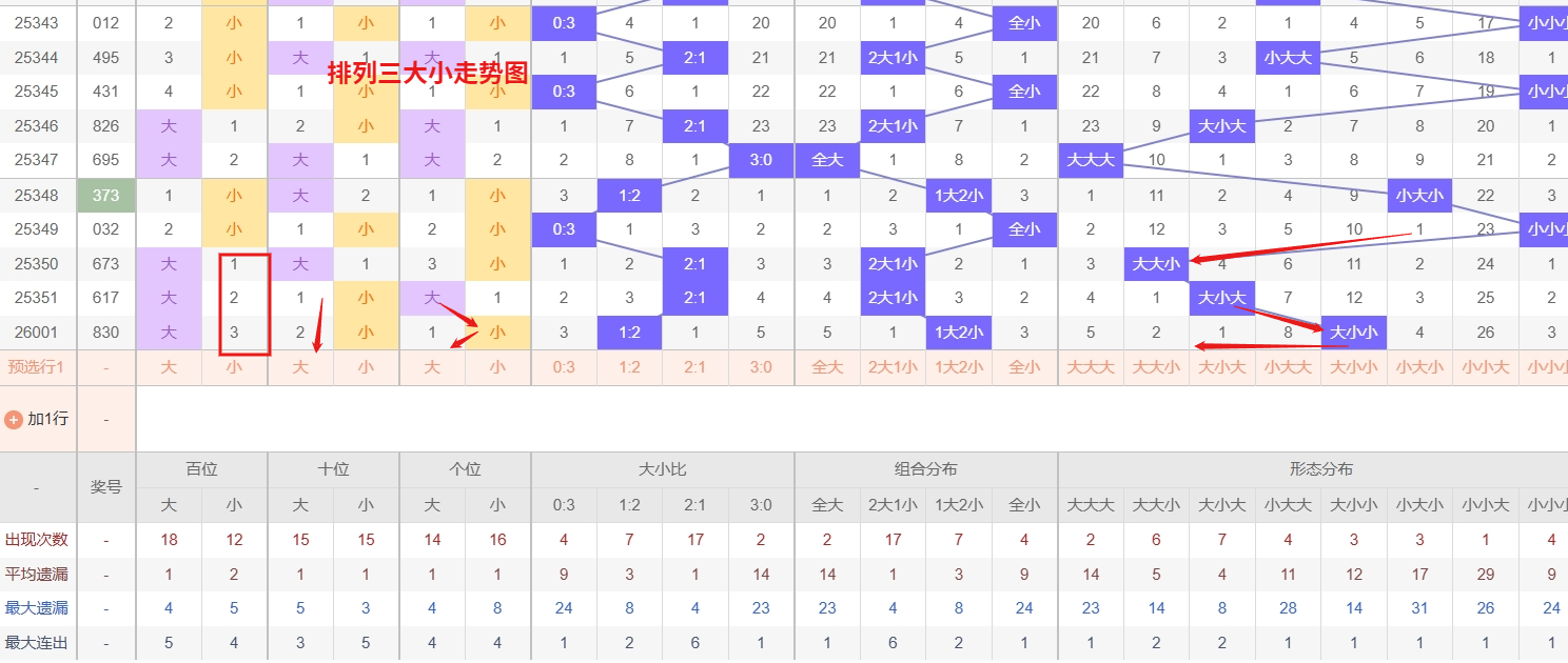 排列三 大小形态分析:从大小走势图上可以看出排列三100期内百位大小比约为48比52,十位大小比约为49:51,个位大小比约为54比46,除了个位奇数比偶数多,十位和百位是偶数比奇数多。历史数据近2期开出大小小下一期的走势为,第275期开出和百位第276期开小小大。第287期开出和百位后第288期开小大大,第307期开出和百位后308期开大大大。近期排列三大小走势分析,“小大大”组合持续走热,表现相当活跃,短期内仍有延续其热态的可能,需作为重点关注对象。与此同时,小小大已遗漏较长时间,处于明显的冷态区间;根据概率回补与走势平衡的规律,冷号在持续低迷后往往具备较强的反弹潜力,其突然回补的可能性不容忽视。因此,当前策略应在追踪小大大热号趋势的同时,对小小大的冷态转折保持警惕,以排列三第2026002期大小形态推荐小大大小小大