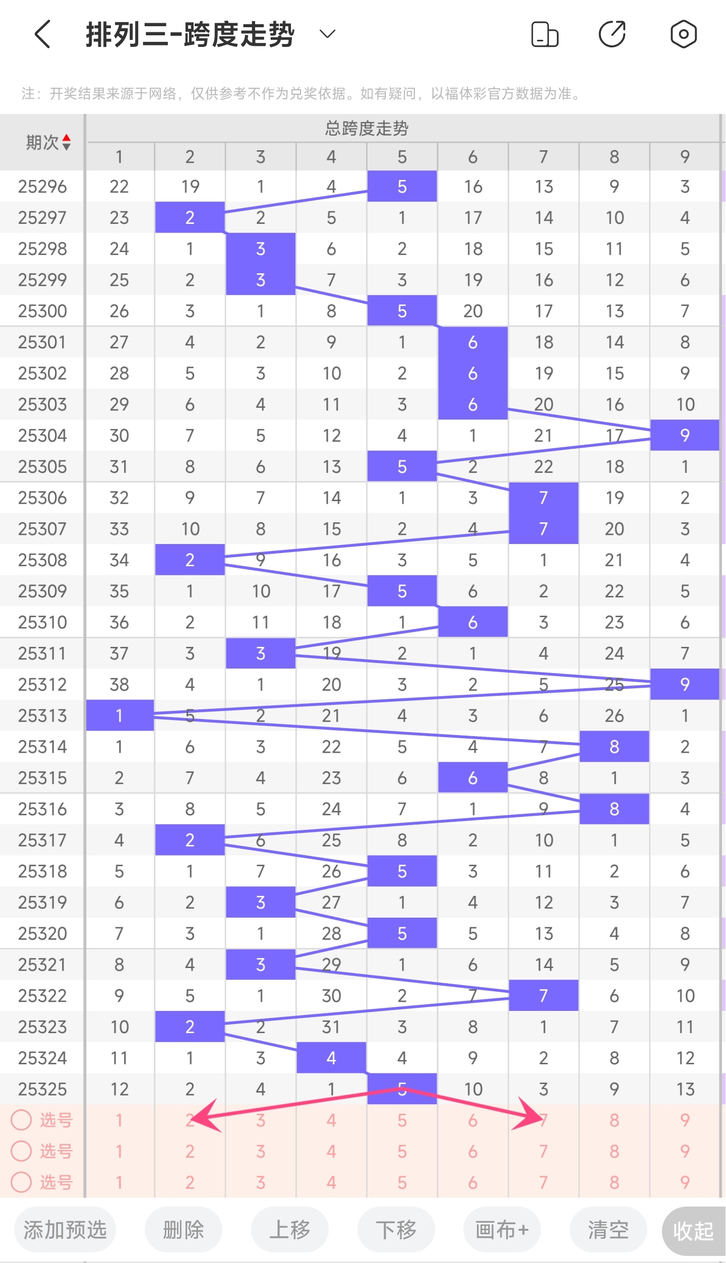 上期跨度为5,往前一期跨度是4,趋势往右移动,偏移量为1。跨度值5时,跨度值是近30期内开出的中间的值。通过走势图分析,目前的趋势是可能往左也可能往右。所以推测本期跨度可能为23478等跨度。